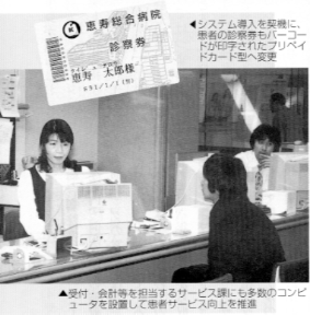 院内の全部署に約230台のパソコン端末とバーコードリーダーを設置しており、神野理事長は、「例えば、患者様の診察券もいわゆるテレホンカードなどで使用されているプリペードカード型へと変更して、各々の診察券にバーコードを印字した。これにより受付から診察、検査そして会計までのすべての流れをバーコード入力によりスムーズな処理が可能となる。また、病院としても、患者様の情報や薬の処方等がバーコード入力で一元的に管理ができ、しかもリアルタイムで情報を把握できるメリットは計りしれない」などの効果を紹介する。