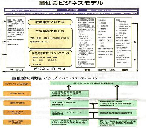 つまりは、限りなく企業経営に近づけていかないとこの戦略は実現できない。そう考えて「董仙会ビジネスモデル」を作製したという。その過程で使った「バランストスコアカード」と併せて読むとわかりやすい。