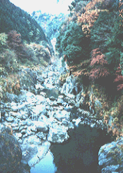 鳩ノ巣渓谷の朝、紅葉した両岸が迫って来る。